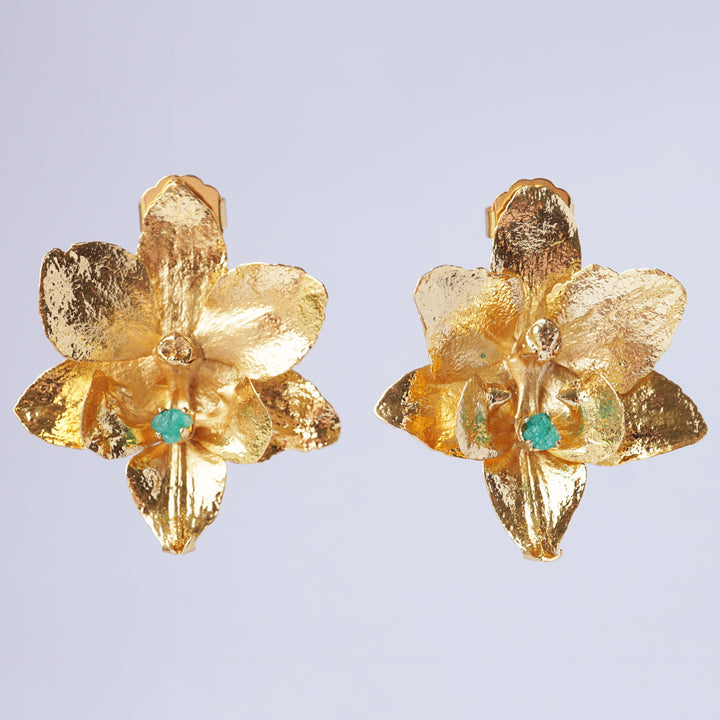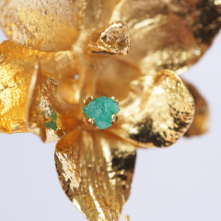 Inspirados en la elegancia silvestre de la orquídea Cattleya, estos aretes inmortalizan flores reales a través de un delicado proceso de fundición, preservando su forma natural para convertirla en una obra de arte eterna. Cada pieza es elaborada a mano y fusionada con esmeraldas colombianas sin tallar, que conservan la fuerza y autenticidad de la tierra. Alma Cattleya celebra la belleza del trópico y la transforma en una joya viva: un tributo a tu alma libre, colorida y naturalmente poderosa.