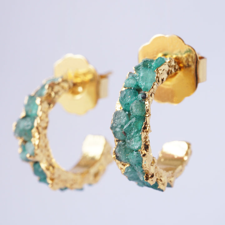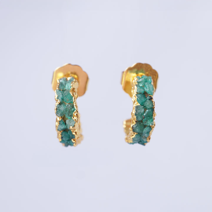 Inspirados en la riqueza del trópico, estos aretes hechos a mano destacan tu estilo con un toque único y vibrante. Elaborados con esmeraldas sin tallar, símbolos de vitalidad y belleza natural, conectan la magia tropical con tu autenticidad.